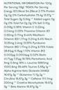 Energy 54.29kcal, carbohydrate 13.57g, sugar 0.54g, Vit C 0.018g, Vit B1 0.04mg, Vit B2 0.21mg, Vit B6 0.21mg, Folate 5.15PG, Vit B12 0.0004pg, Biotin 75pg, Pantothenic Acid 7.51pg, L-Leucined 1000.8mg, Taurine 1g, AAKG 3g, Glutamine 2g, Citruline 3g, Caffeine 200mg, creatine monohydrate 3g, beta Alanine 3g