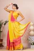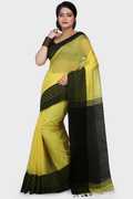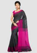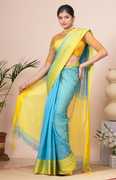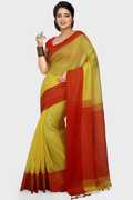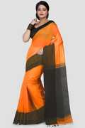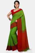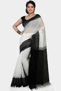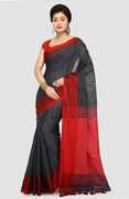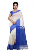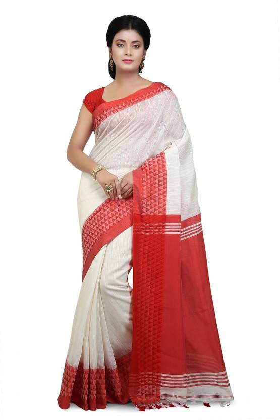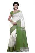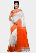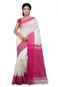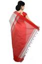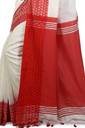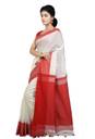 WHITE COLORED SAREE WITH CONTRASTED WOVEN RED BORDER MADE OF PURE KHADI SILK FABRIC, GIVES A RICH PERSONALITY AND GRACEFUL LOOK.COMES ALONG WITH CONTRASTED BLOUSE PIECE.MADE BY THE WEAVERS OF MY STORY FROM BENGAL.