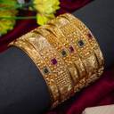 Crafted with gold plating, these bangles have a luxurious, radiant finish, perfect for festive celebrations, weddings, or cultural events. The paisley design adds a touch of sophistication, while the multicolor rubies bring out the rich hues, making this set a perfect blend of modern flair and traditional charm.