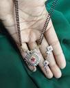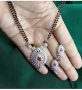 This lovely american diamond mangalsutra from the house of Matrashakti has been exclusively designed for you. This beautiful ad Mangalsutra/Tanmaniya/Nallapusalu is studded with real look-alike american diamonds, along-with semi-precious ruby/emerald/sapphire stones, and kundan. The CZ (cubic zirconia) stones used in crafting this elegant mangalsutra make it look like a real diamond mangalsutra. For shine and protection, this just like real diamonds mangalsutra is gold plated with 18 karat gold and rhodium. The pair of matching tops complement this mangalsutra, making it the perfect fit for any party or special occasion; its graceful design complements any ethnic or western outfit. Exquisite Handmade Jewelry Handcrafting jewelry is a skill that our master craftsmen have picked from their ancestors. They are doing it for many generations to give you the best quality final products. Precision and elegant finish is something you would get to experience through the skilled hands of our manufacturers. TREND:- New and stylish design of Mangalsutra for everyday Double/Single string design gives it a unique look.Perfect to wear on suit and salwar or on kurta or even with saree.You can wear it at any occasion and can carry it in your offices also. The length of the mangalsutra chain is 18 inches. INFO:- Ethnic Traditional Gold Plated round Mangalsutra For Women's. It's Without Nickel And Lead As Per International Standards That Makes It Very Skin Friendly CARE INSTRUCTION:- It's Advisable To Store Jewellery In A Air Tight Pouch/Box,Keep Away From Water, Perfume And Other Chemicals. GIFT:- Ideal Valentine,Birthday, Anniversary Gift For Someone You Love { Beautifully Crafted }