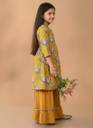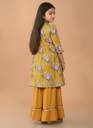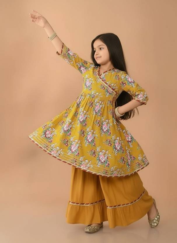 Design & Pattern: Beautiful floral printed angrakha-style kurti paired with solid mustard sharara pants featuring lace border detailing., Fabric & Comfort: Made from soft, breathable cotton ensuring long-lasting comfort for your child’s delicate skin., Fit & Style: Regular fit with flared kurti design and 3/4th sleeves, offering a perfect festive ethnic look., Occasion Type: Ideal for festive events, family functions, weddings, cultural programs, and party wear., Care Instructions: Hand wash or gentle machine wash separately for long life and color retention.