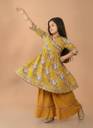 Bring charm and elegance to your little one’s wardrobe with this beautiful mustard yellow kurti sharara set. The outfit features a floral printed angrakha-style kurti paired with solid mustard sharara pants, making it perfect for festive occasions, weddings, or family gatherings.