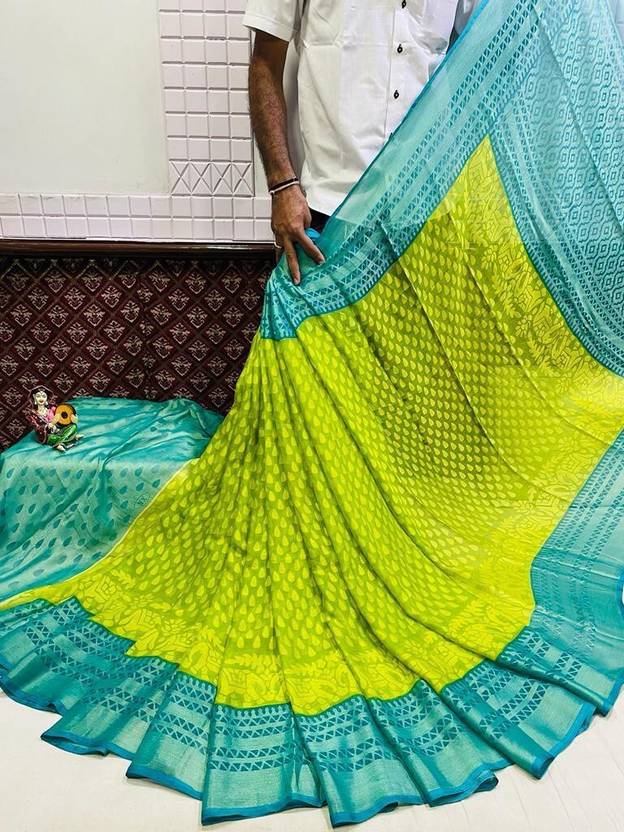 Printed Bollywood Chiffon, Brasso Saree (Light Blue, Green)