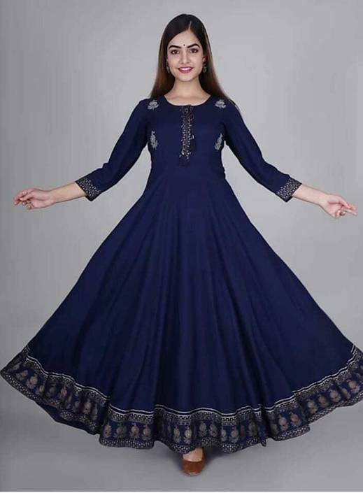 Nandi Printed Rayon Blend Stitched Flared/A-line Gown  (Blue)