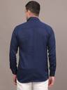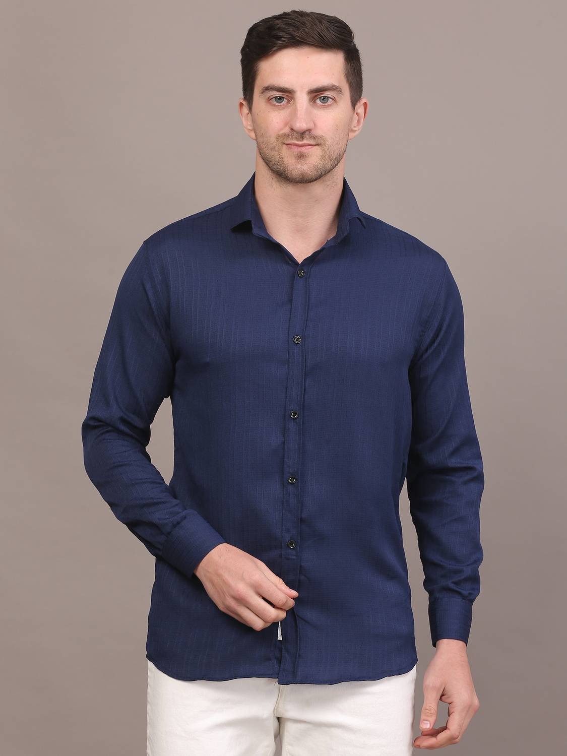 This is a navy blue full-sleeved shirt featuring a subtle vertical self-design texture. It comes with a classic collar and a full button placket. The shirt has buttoned cuffs and appears to have a regular fit, providing both comfort and a smart appearance. It can be styled with a variety of bottoms such as jeans, chinos, or trousers.