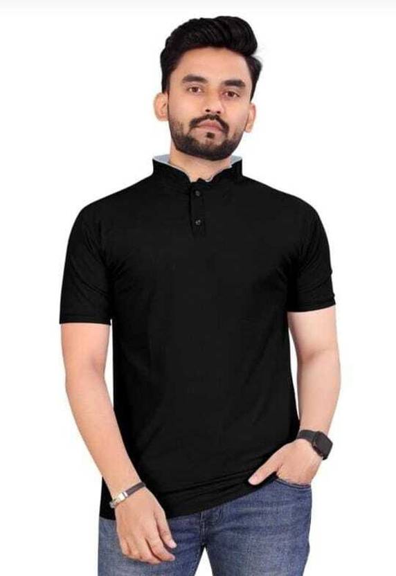 Men Solid Mandarin Collar Polycotton Black T-Shirt