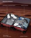 Large (L) -28-inch hard sided spinner luggage - ideal for trips lasting longer than a week. This bag can easily carry weight up to 25 Kg's.Outer Material: Luggage is made from 100% polypropylene which is very resilient, durable and lightweight. It is made to absorb impact by flexing while under stress then popping back to its original shape, eliminating dents and dings while protecting its contents.Aluminium Telescopic handle for comfortable manoeuvring. 8 silent spinner wheels with 360 degrees rotation for effortless mobility in any direction. Each bag has a separate built-in number lock (pre-set code 0-0-0) to ensure security of your bag.Spacious main compartment to keep your clothes, shoes and travel essentials. Fully lined roomy interior with the down straps and zippered divider to secure contents and for easy organization.Warranty: 3 Years warranty on shell & 1 year warranty on accessories. Wear & Tear for product under use and scratches are�not�covered.