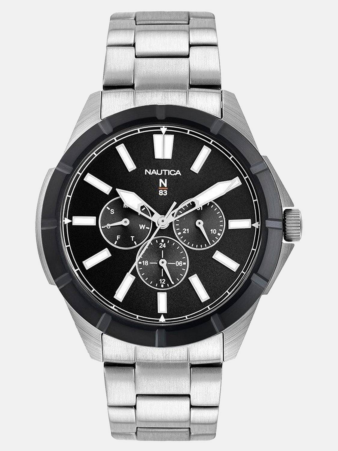 Nautica N83 Men 44mm Round Black+Silver Stainless Steel case with Black Multifunction dial with Luminant Hands and Silver Stainless Steel Bracelet.
