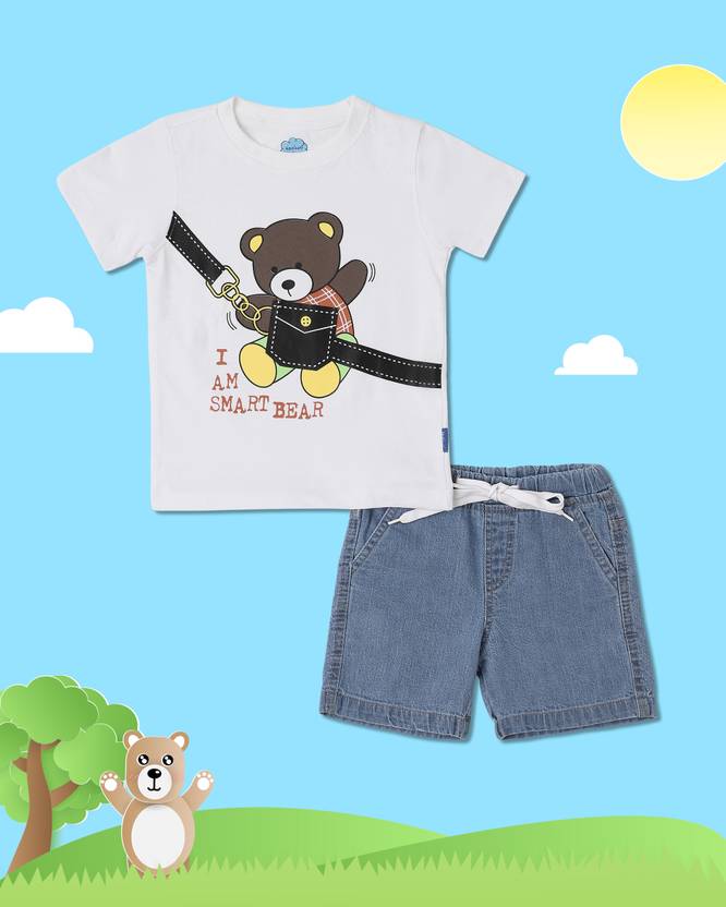 The 100% cotton, half-sleeve T-shirt and cotton-poly-denim shorts in this clothing set will keep your kid comfortable all day long.