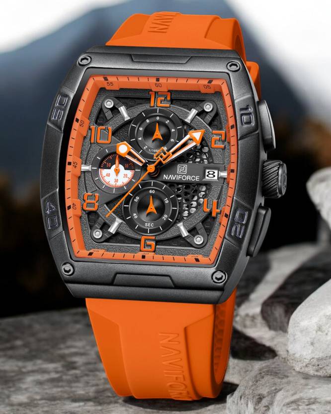 The Naviforce NF8052 seamlessly integrates innovation and uniqueness with its sleek barrel-shaped case and cutting-edge skeleton dial, redefining the concept of sports watches by blending style, functionality, and durability. The three chronograph subdials and professional sports design embody a perfect fusion of form and function. The luminous display ensures that time is easily accessible even in the most challenging conditions. Additionally, the NF8052 reflects a commitment to environmental consciousness and resilience with its eco-friendly ion plating and hardened mineral glass, along with 3ATM water resistance and an ergonomic silicone strap. This combination of innovative design and high-quality construction makes it an enticing product for sports enthusiasts and environmental advocates alike.
