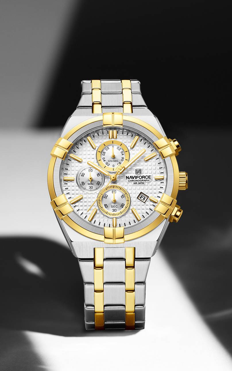 The NF8042 is the latest masterpiece from the NAVIFORCE design team, combining exquisite craftsmanship and bold innovation, showcasing the brand’s outstanding capabilities in design and manufacturing. The NF8042 perfectly blends the creative “claw” shape with a metallic bezel, complemented by silver-white sub-dials, creating a powerful visual impact. Apart from its striking appearance, this watch also boasts excellent durability. It features a quartz movement for precise timekeeping and a hardened mineral glass for enhanced clarity. The hands and markers on the dial are coated with luminous material, ensuring clear visibility in low-light conditions. With a stainless steel strap, it provides a comfortable and abrasion-resistant wearing experience. Overall, the NF8042 is a forward-thinking, powerful, and reliable practical product. Choosing the NF8042 will add more highlights to your product line and bring more surprises to your customers. ◉ Innovative “Claw” Design: