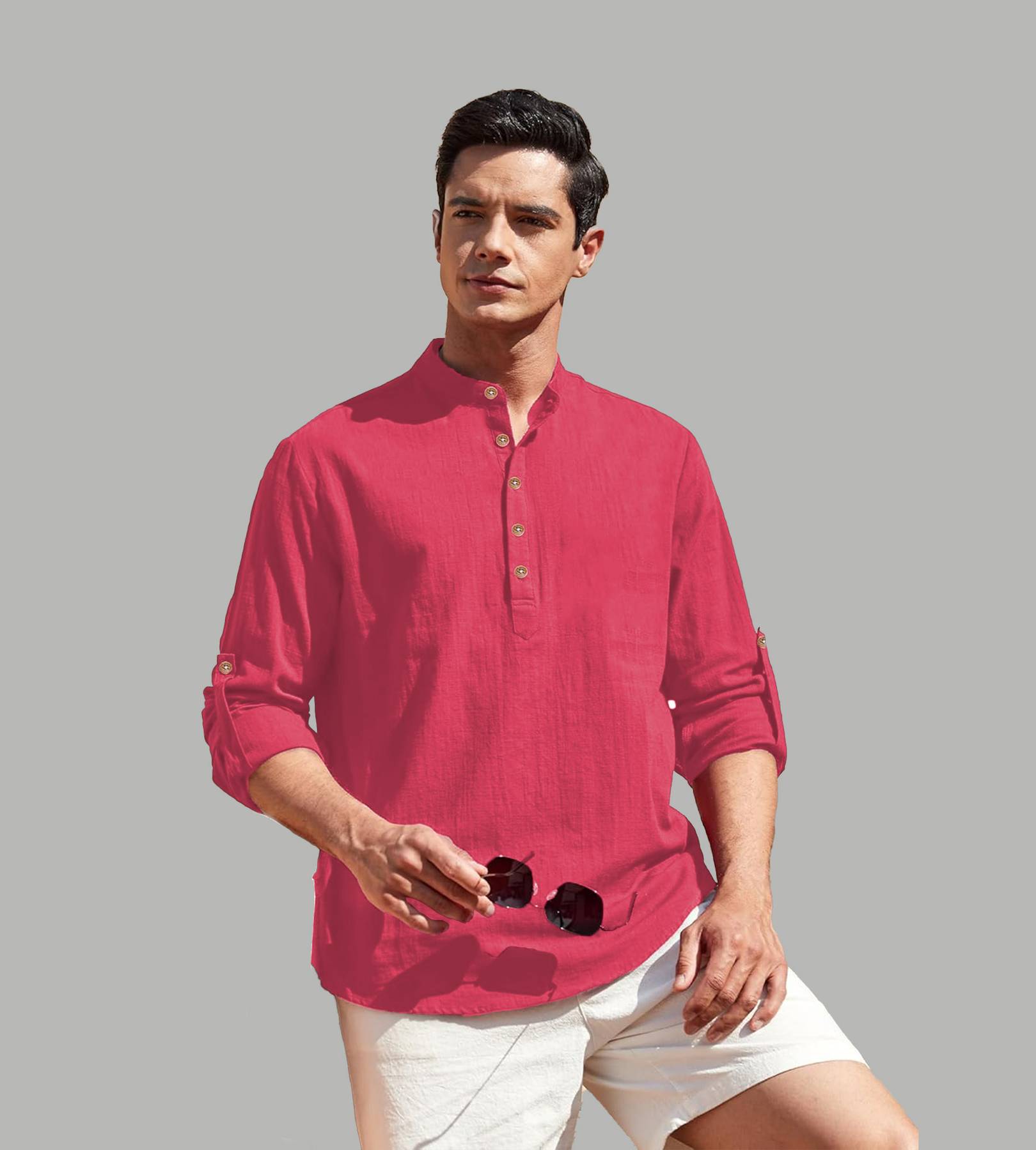 This pure cotton beige short kurta is perfect for men who value style and comfort. Its versatile design makes it ideal for any occasion—festivals, parties, or casual outings. Product Details ?? ????? Gender: Men ?? Pattern: Solid ?? Design Type: Plain ?? Closure: Button ?? Sleeve: Full Sleeve (Roll-Up Option) ?? Waist Rise: Mid-Rise ?? Collar: Mandarin/Chinese ?? Hemline: Curved ?? Fabric: Pure Cotton ?? Product Length: Short ?? Pack of: 1 Material & Care ?? Fabric: 100% Cotton Wash: Suitable for hand wash and machine wash. How to Style ?? Pair it with dark-wash denim or linen trousers for a casual look. Dress it up with a pair of churidar or slim-fit pants for festive occasions. Add leather sandals or loafers and a wristwatch for a classy finish. Roll up the sleeves for a relaxed vibe during daytime events. This short kurta seamlessly blends traditional elegance with modern styling, making it a wardrobe essential for every man! ??
