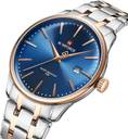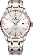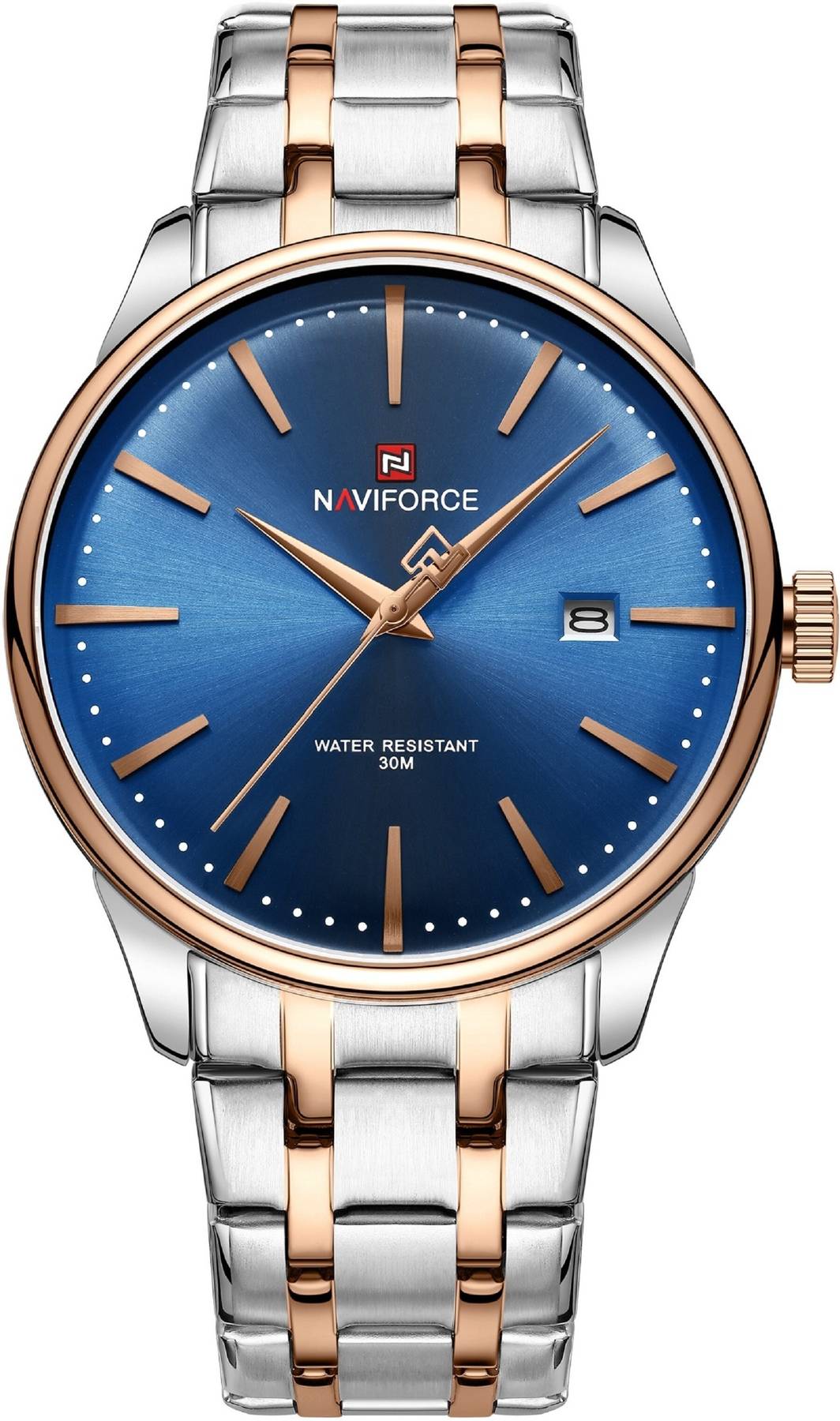 The Naviforce NF9230_S/BE/RG features a striking rose gold and black color combination, which adds a touch of elegance and sophistication to its overall appearance. The dial is round, measuring 42mm in diameter, and is crafted from hardlex, known for its scratch-resistant properties. This ensures that the watch maintains its pristine look even with everyday wear. The design of the dial is both functional and stylish, providing a clear view of the time while complementing the watch's luxurious aesthetic.