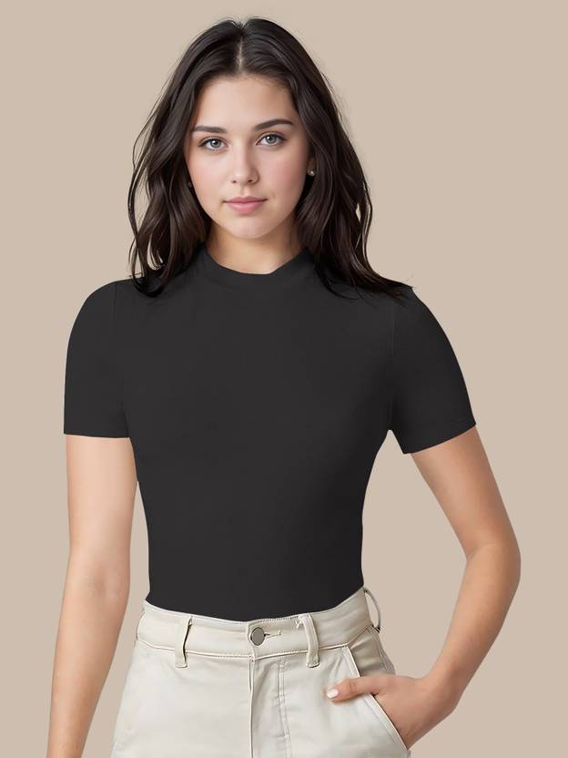 Dream Beauty Fashion Casual Polyester Blend High Neck Short Sleeves stylish Black Top(17"Inch)