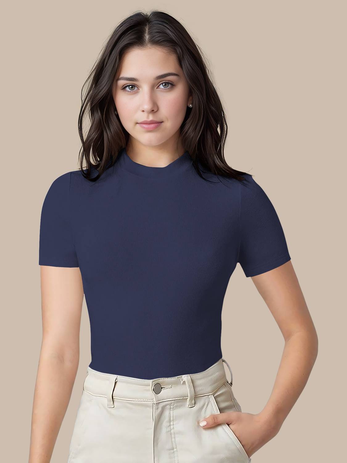Kashonaa Casual Polyester Blend High Neck Short Sleeves stylish Navy Blue Top(17"Inch)