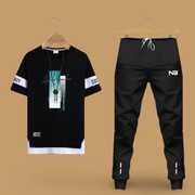 A stylish men's two-piece tracksuit, perfect for a casual look or athletic wear. The set includes a Roundnack sweatshirt with a unique black and graphic design and matching black joggers featuring a subtle "NB" logo and reflective stripes on the calves. The entire outfit is presented hanging against a solid brown background.