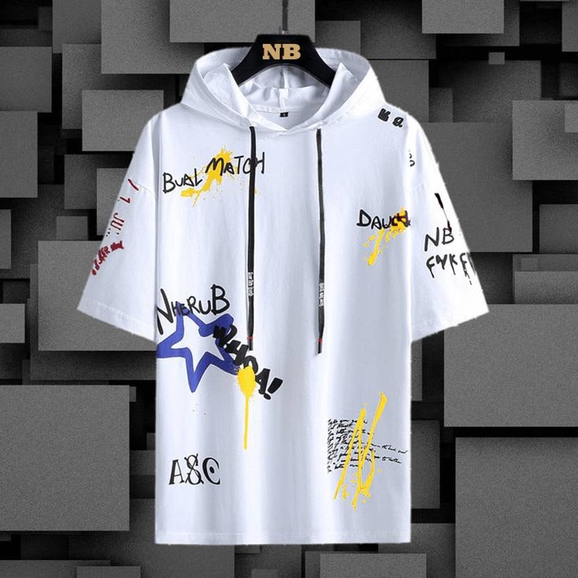 NB NICKY BOY Men Printed Hooded Neck Cotton Blend White T-Shirt