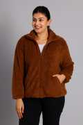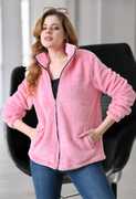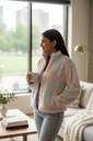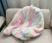 Featuring a zip-up front and high neck collar, this jacket boasts a plush, fluffy texture and an all-over pastel color pattern in soft hues of pink, blue, yellow, and cream. Perfect for layering on chilly days, it offers both comfort and charm for everyday wear or lounging.