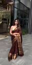 This is a beautiful Banarasi silk blend saree in a rich brown color. The saree comes with an elegant golden zari woven border that gives it a royal and traditional look. The pallu has heavy golden weaving with floral designs, making it perfect for festive and wedding wear.