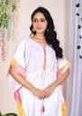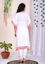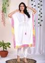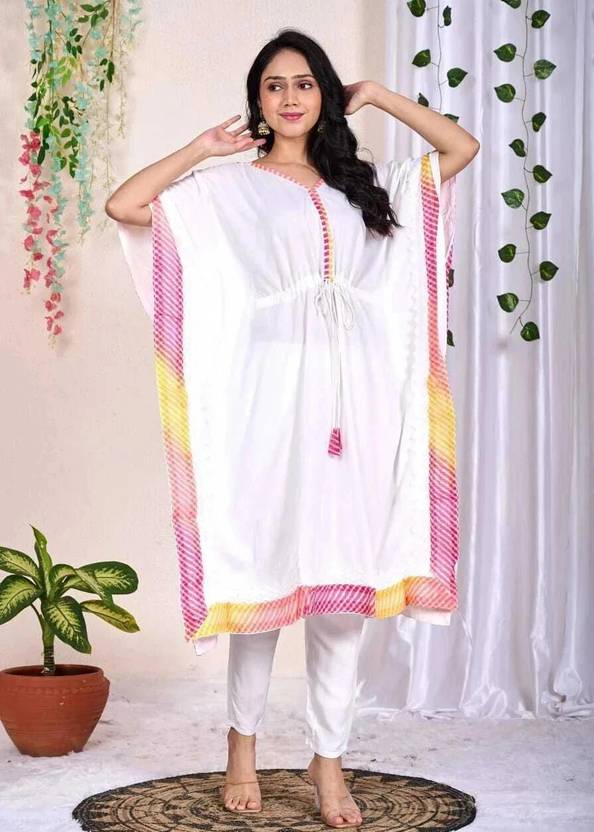 Step into comfort and style with the elegant White Kaftan Kurta with Leheriya Border and Trouser Set. This stunning kaftan kurta set is perfect for women who love a blend of traditional charm and contemporary comfort. Made from soft, breathable rayon, it ensures a relaxed yet stylish look, ideal for daily wear, casual outings, or special occasions. The kaftan kurta features a unique leheriya border, adding a pop of color and intricate detailing to the classic white design. The lightweight and flowing fit of this kaftan for women provides maximum comfort, while the straight-cut trouser completes the look, offering a modern twist to the traditional ensemble. Whether you're looking for a chic kaftan dress for casual wear or a more refined kaftan kurti for women for a festive occasion, this kaftan kurta set for women is versatile and stylish. The set also includes a matching kaftan kurta pant set, offering a complete outfit thatโs both trendy and comfortable. Ideal for those who appreciate the fusion of elegance and ease, this kaftan kurta set is a timeless addition to your wardrobe. Embrace effortless sophistication with this beautiful kaftaan that combines style, tradition, and comfort in one stunning piece.