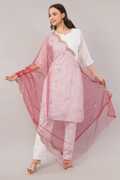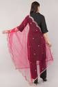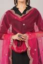 Upgrade your ethnic wardrobe with this Negchaar Red Net Dupatta, beautifully designed with cutwork and mirror work for women. This 2.5-meter dupatta features golden embroidered buttis all over and an exquisite scalloped border that adds a luxurious finish.