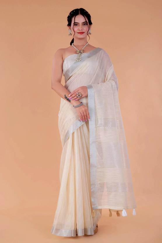 Negroni Brand Presents Linen Fabric Based Saree With Matching-Tone Latkans And An Unstitched Blouse Piece, Crafted In A Soft And Lightweight Texture For Comfortable Everyday Wear.