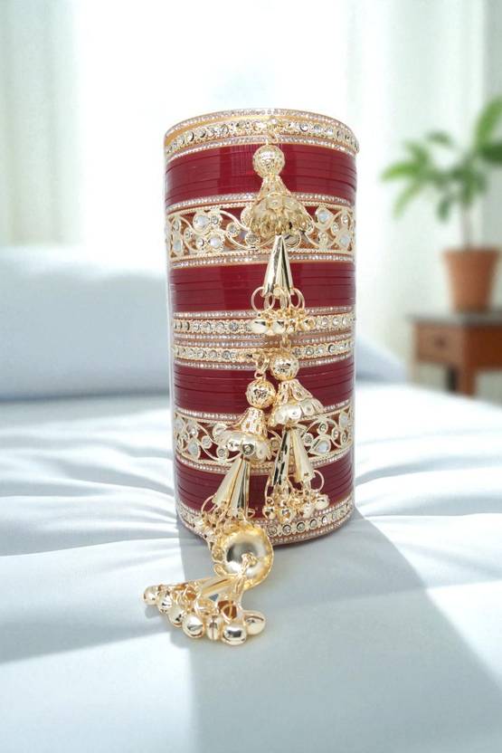 This Punjabi Chuda Set Include 42 Pieces(2 Polki Kada, 4 Latkan Chudi, 12 Slim Diamond Chudi, 24 Plain Maroon Chudi) For Wedding, Religious, Love & Party Occasions.