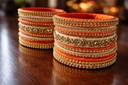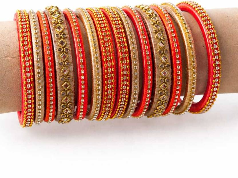 Add a touch of traditional elegance to your ethnic wardrobe with this stunning 14-piece Silk Thread Bangle Set. Meticulously handcrafted with premium quality silk and adorned with shimmering stone-work, this set is designed to make you shine at weddings, festivals, and special occasions. The vibrant orange and royal gold combination complements a wide range of outfits, from sarees to lehengas.