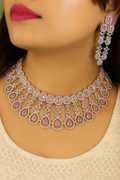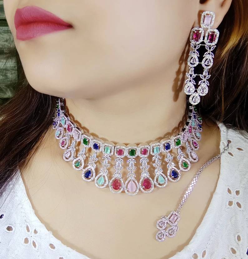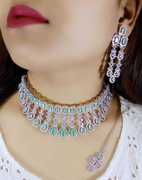 Elevate your elegance with this breathtaking choker necklace set, featuring a dazzling array of multi-colored gemstones in teardrop and square cuts. Designed with precision, the necklace is adorned with shimmering cubic zirconia and accented by a stunning combination of emerald green, ruby red, sapphire blue, and blush pink stones. The set includes matching statement earrings that beautifully complement the intricate craftsmanship of the choker.
