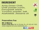 • Amla,Green Chilli,Chilli powder,cumin,Fenugreek seeds,Turmeric powder,salt,Asafoetida,sesame oil