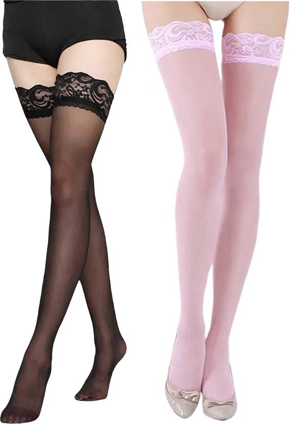 Neska Moda Presents 2 Pair Stylish And In Trendy Premium Quality Ultra-Thin High-Leg Lace transparent stretchable Thigh High Stocking.This Stocking With Black and Pink Lace on Top Can Be Easily Matched With Your Outfit. This imported stocking is Highly Stretchable without loosing its grip to the skin. This Thigh High Stockings Is Made Of 90% Nylon And 10% Spandex.The Stretch-Fit Design Means That This Stocking Fits Easily And Adjust Beautifully To Give You The Snuggest Fit You Can Ever Have.This Help You Maintain An Awesome Eye Contact On Your Legs. This Is The Best Quality Out There. Wear This With Your Dresses, Shorts, Ripped Pants And Jeans, Or Basically Anything In The Town - Without Worrying About Accidentally Ripping Them. Features: Anti-Bacterial, Anti-Embolism, Anti-Foul, Breathable, Sustainable, For Diabetic, For Varicose, Permeable, QUICK DRY, Sporty, Sweat-Absorbent, Thermal, Breathable, Permeable, QUICK DRY, Transparent, compression, Sequin, Fishnet