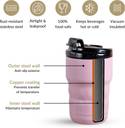 Design: The travel coffee mug features a double-wall construction made from 304 and 201-grade stainless steel, offering both durability and style. Its vacuum-insulated design, enhanced with a copper coating, keeps drinks hot for 8 hours or cold for 10 hours. The sweatproof, scratch-resistant exterior, combined with an anti-slip diamond grip, ensures a secure hold, while the smooth matte finish adds a refined touch.
