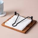 MATERIAL, DIMENSIONS, SET SIZE: [Material] Iron - powder coating, Base - Mango Wood; [Dimensions] 7.5 L X 7.5 W Inches; [Set Size] 1 wooden Napkin Holder