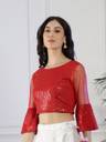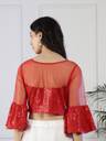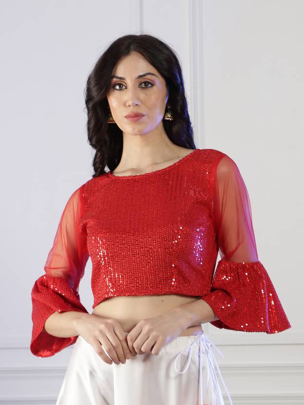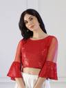 NEUDIS Women Red Sequence Bell Sleeve Blouson Crop Top