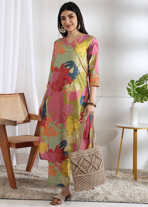 Fabric: Soft and breathable poly rayon, Design: Stylish floral print with vibrant multicolor pattern, Set Includes: Long kurta with matching palazzo pants (2-piece set), Kurta Length: 44 inches | Palazzo Length: 37 inches, Sleeves: 3/4 sleeves, Occasion: Perfect Cord Set for festive wear, casual outings, or office.