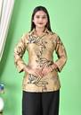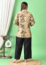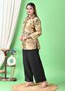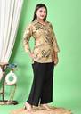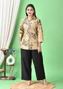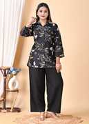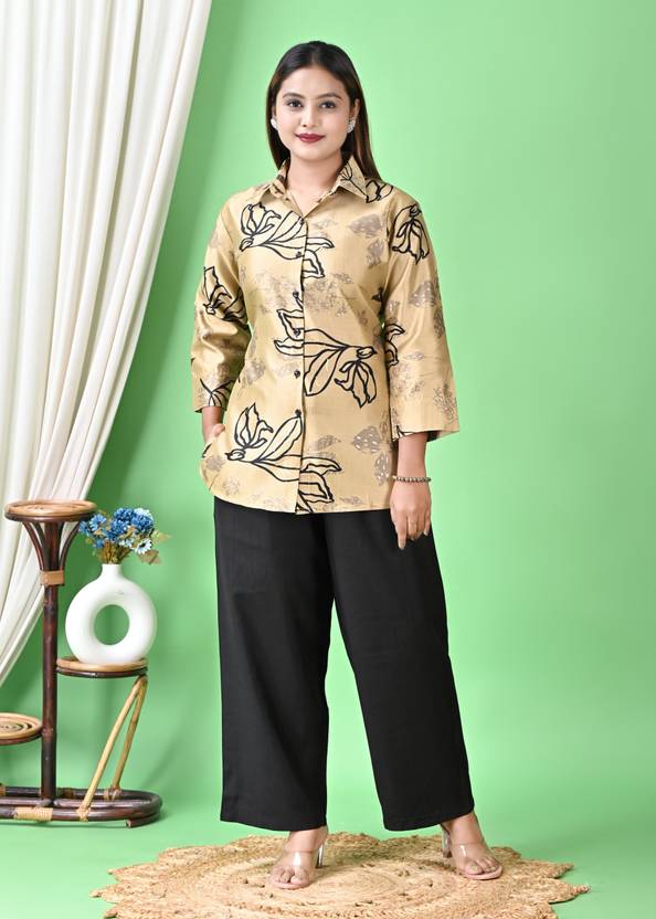 Elevate your everyday style with this elegant women’s shirt and palazzo set. The golden-beige shirt features a stylish black floral print with full front button closure and 3/4th sleeves, adding a modern yet classy touch. Paired with solid black wide-leg palazzo pants, this outfit ensures both comfort and sophistication. Perfect for office wear, casual outings, or occasions.