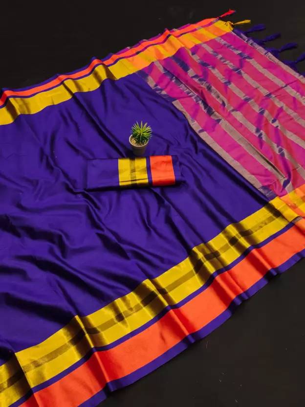 NightBlue Solid/Plain Banarasi Cotton Blend Saree (Blue)