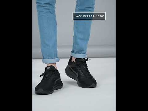These black running shoes are made with synthetic leather, giving them a stylish and durab...