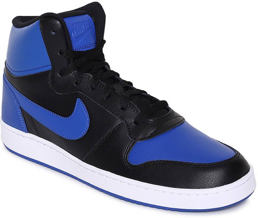 Design Details:A pair of round-toe black & blue sneakers, has mid-top styling, lace-up detailLeather upperCushioned footbedMoulded rubber outsoleTextured and patterned outsoleWarranty: 6 monthsWarranty provided by brand/manufacturerAbout NIKE EBERNON MID:The Nike Ebernon Mid Trainers is crafted with a premium leather upper, styled with a mid cut ankle and retro Nike branding embossed to the heel for a traditional look.
