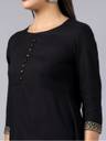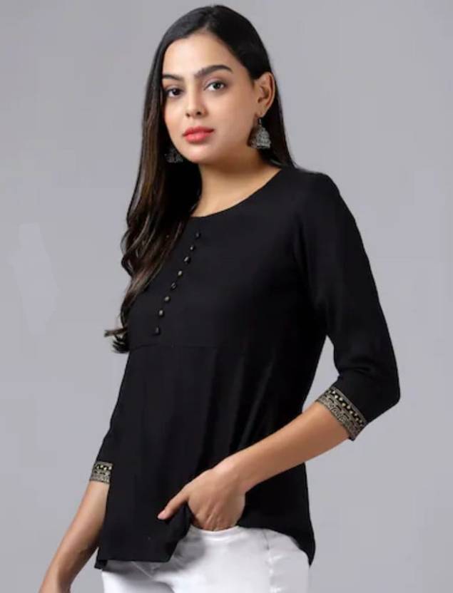 We have crafted this women's top from solid rayon fabric. On which cloth buttons are attached and printed border is also attached in the sleeves.