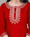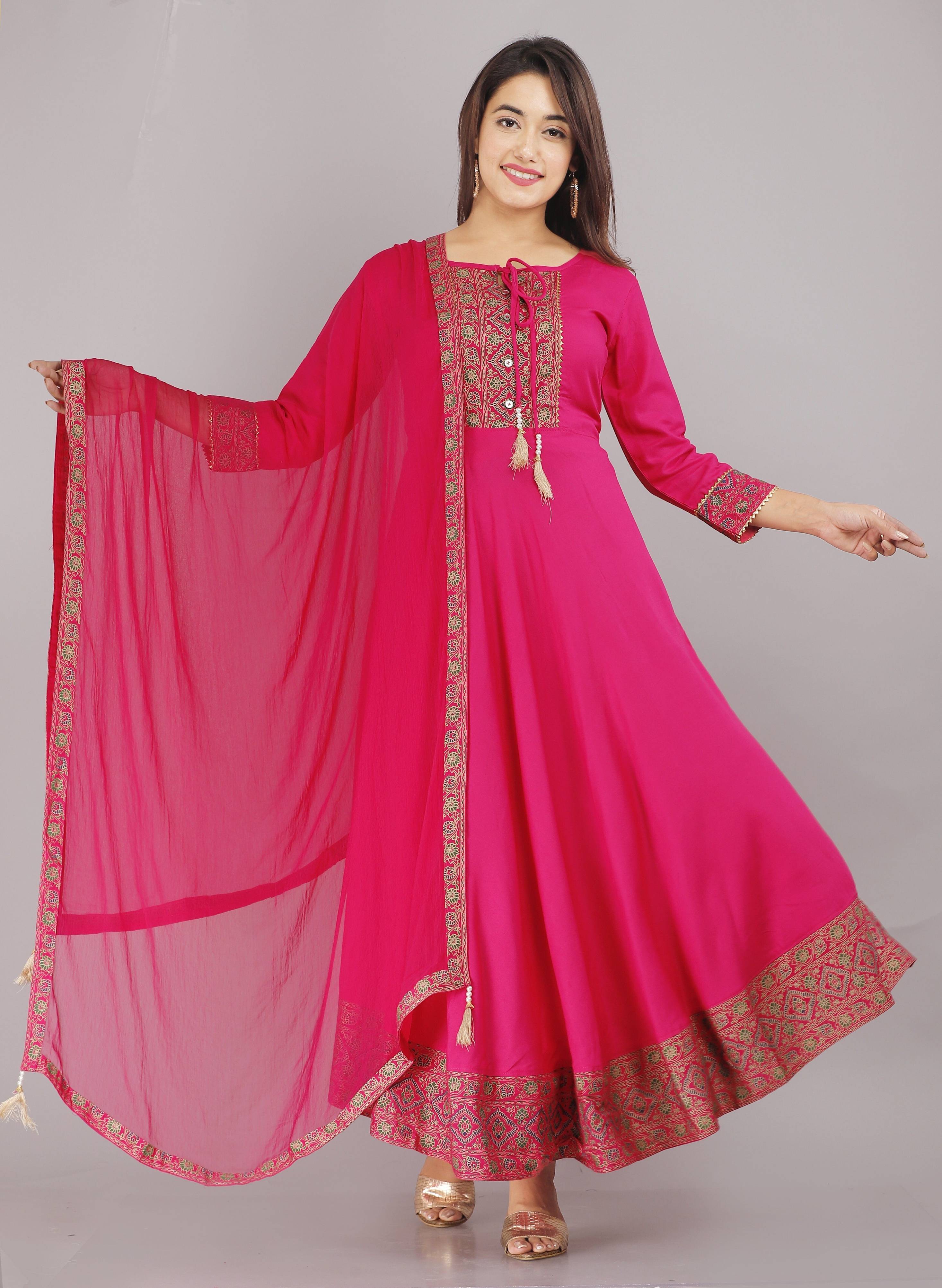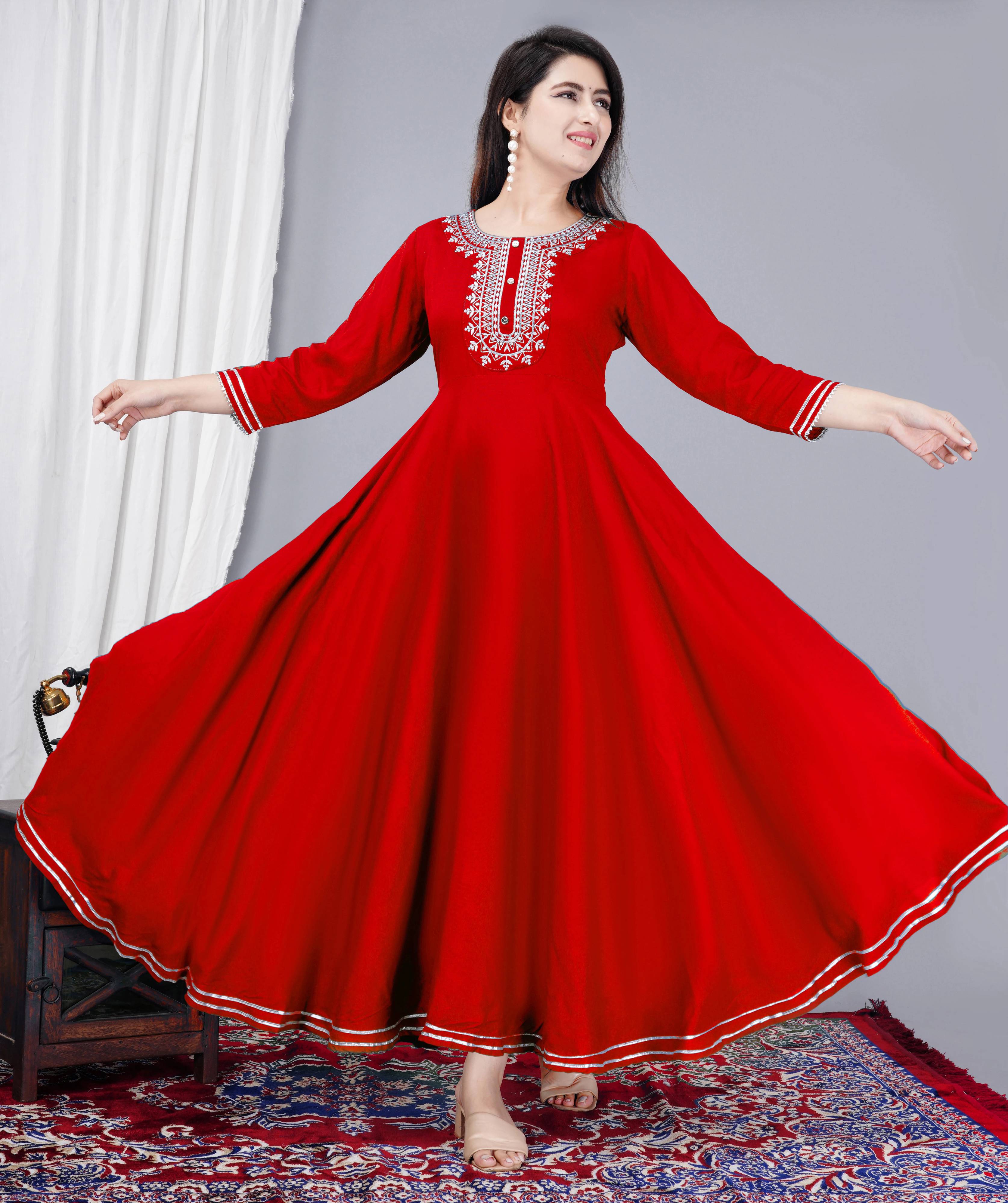 We have created this women's anarkali kurti from a solid rayon fabric. This new trending kurti is having embroidery on the front neck. Gotta attached at the bottom of the sleeves . The hoop of this kurti is also very nice. And its length is 48 inches. The fitting of this kurti is also very nice. And you will get the same product as seen in the photo shoot.