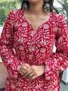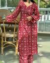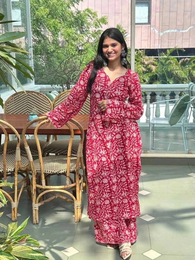 Crafted with sustainable rayon, this set supports eco-conscious fashion choices. Its durable stitching and color-fast print ensure long-term usability with easy maintenance. Whether styled with oxidized earrings for festive charm or kept minimal for everyday wear, this kurta set is a versatile addition to any woman’s wardrobe. Red rayon kurta set, women ethnic wear, floral printed kurta, casual festive outfit, long sleeve kurta set, straight fit kurta palazzo, breathable rayon ethnic wear, Indian traditional dress for women.