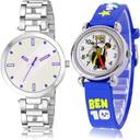 Dial Colour : White ; Band Colour : Silver And Blue ; Case Shape : Round ; Band Material : Metal And Plastic ; Case Diameter : 36 And 29 mm ; NIKOLA Classical Collegian Simple Chain And Ben 10 Kids Silver And Blue Colour Analog Metal And Plastic Belt 2 Watch Combo For Women And Girls - GM239-GC92