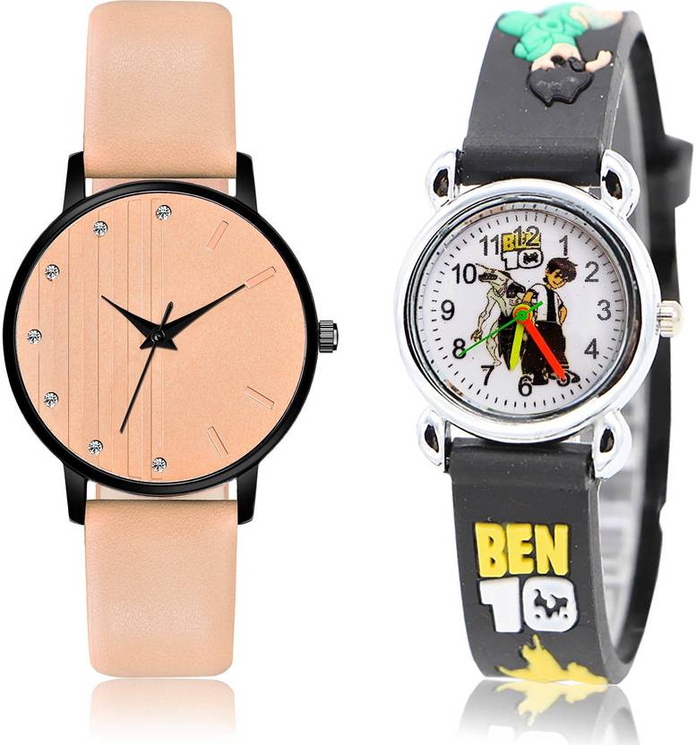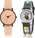 Dial Colour : Orange And White ; Band Colour : Orange And Black ; Case Shape : Round ; Band Material : Genuine Leather And Plastic ; Case Diameter : 32 And 29 mm ; NIKOLA Classical Fashionable Embossed Designer Dial And Ben 10 Kids Orange And Black Colour Analog Genuine Leather And Plastic Belt 2 Watch Combo For Women And Girls - GM322-GC85