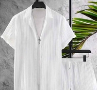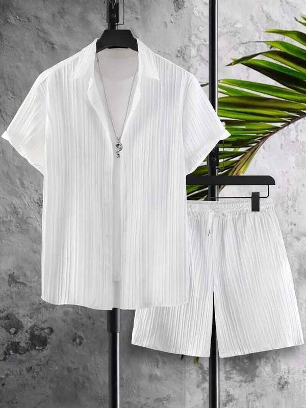 Featuring solid pattern with striped texture, this men's shirt and shorts set combines subtle design detail with a structured appearance. The striped texture across the fabric adds depth and character while maintaining a clean, casual look. This visual style makes the set suitable for pairing with casual shoes or accessories for a coordinated outfit during warm-weather outings or relaxed gatherings.