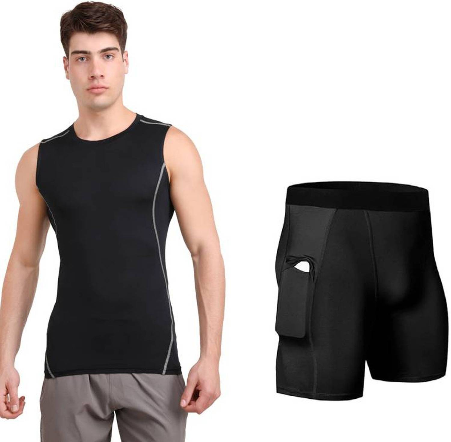 Men's Polyester Sports Running Set Compression sleeveless vest, Sando,Tank Top Skin Tight half Pant Gym Yoga Suits Set of 2