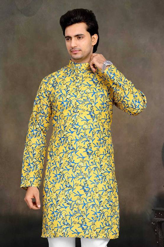 Nirwear Men Printed Viscose Rayon Straight Kurta  (Yellow)