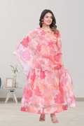 It is designed to complement the gown, making it perfect for special occasions like weddings, parties, or festive celebrations. The transparent nature of organza adds a touch of sophistication and charm to the overall look.