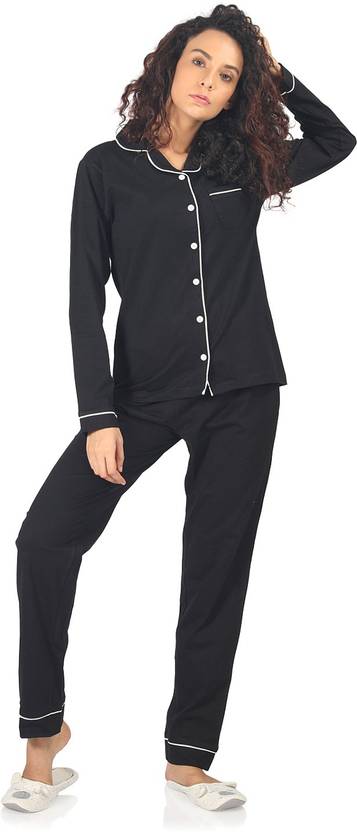 Nothing beats a classic all-black pj set to go with every mood you can think of. Crafted from 100% cotton knit for blissful comfort, featuring a classic collared button-down long sleeve top with matching pajamas. Contrast white buttons and piping on sleeves, chest pocket and bottoms, spun satin ribbon drawstring and side pockets are added extra details for a great sleep and lounge experience. Perfect for cozy weekends and slumber parties!