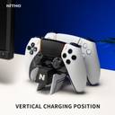 Twin slot - Charging station Compatible with PS5 Dualsense™/Edge™wireless controllers, twin slots for charging two controllers at the same time, Dock-in design - Dock effortlessly with the charging station’s dock-in design. A guide drives the controller in position and keeps it firmly connected, Free up console's ports - Your DualSense™ controllers charge as fast as when connected to your PS5® console, so you can free up USB ports and get your controllers docked and more organized, Safe charging - The built-in safety circuit prevents both charging station and controllers from being over-heated, blocking over-current, over voltage and short-circuit, USB powered - Power up the charging station by connecting it to a PS5® console, a PC, a power bank, or any compatible power adapter. The USB-C cable to power the charging station is included, PS5® console design - Same black & white design inspired by PS5® console and DualSense™ controller: NITHO® PS5 Vertical Charging Station perfectly suits your gaming zone